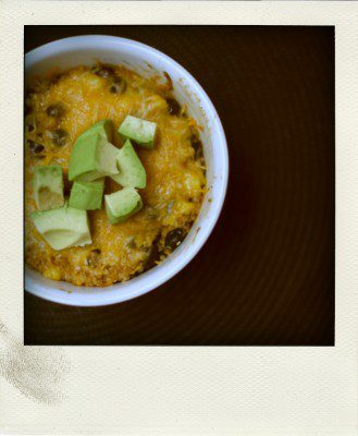 I throw frozen corn, canned black beans, chopped raw onions and peppers, quinoa and shredded bagged cheese in the oven and bake. Then I put avocado and sour cream on it. It is awesome! I have zero time to make anything and I just keep them in the fridge all week and pull them out when I need them. They have saved me from dark times (going to McDonald’s for dinner and a Hi-C Orange Fanta).